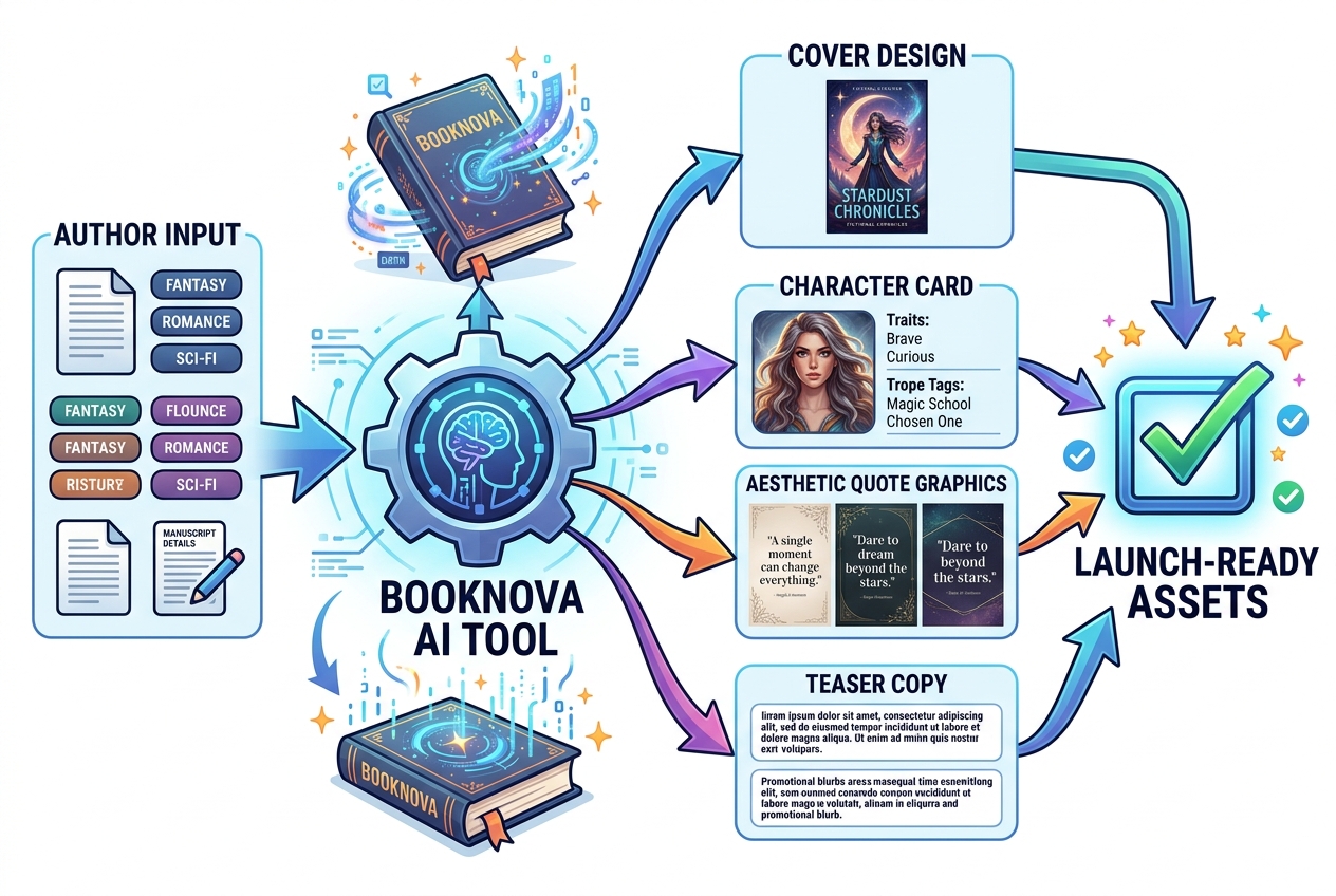 BookNova's Author Launch Kit bundles all of this together automatically: character cards with portraits and trope tags, aesthetic quote graphics pulled directly from your book text, and teaser copy ready to paste into a caption. The whole package generates the moment your book is ready. No Canva.