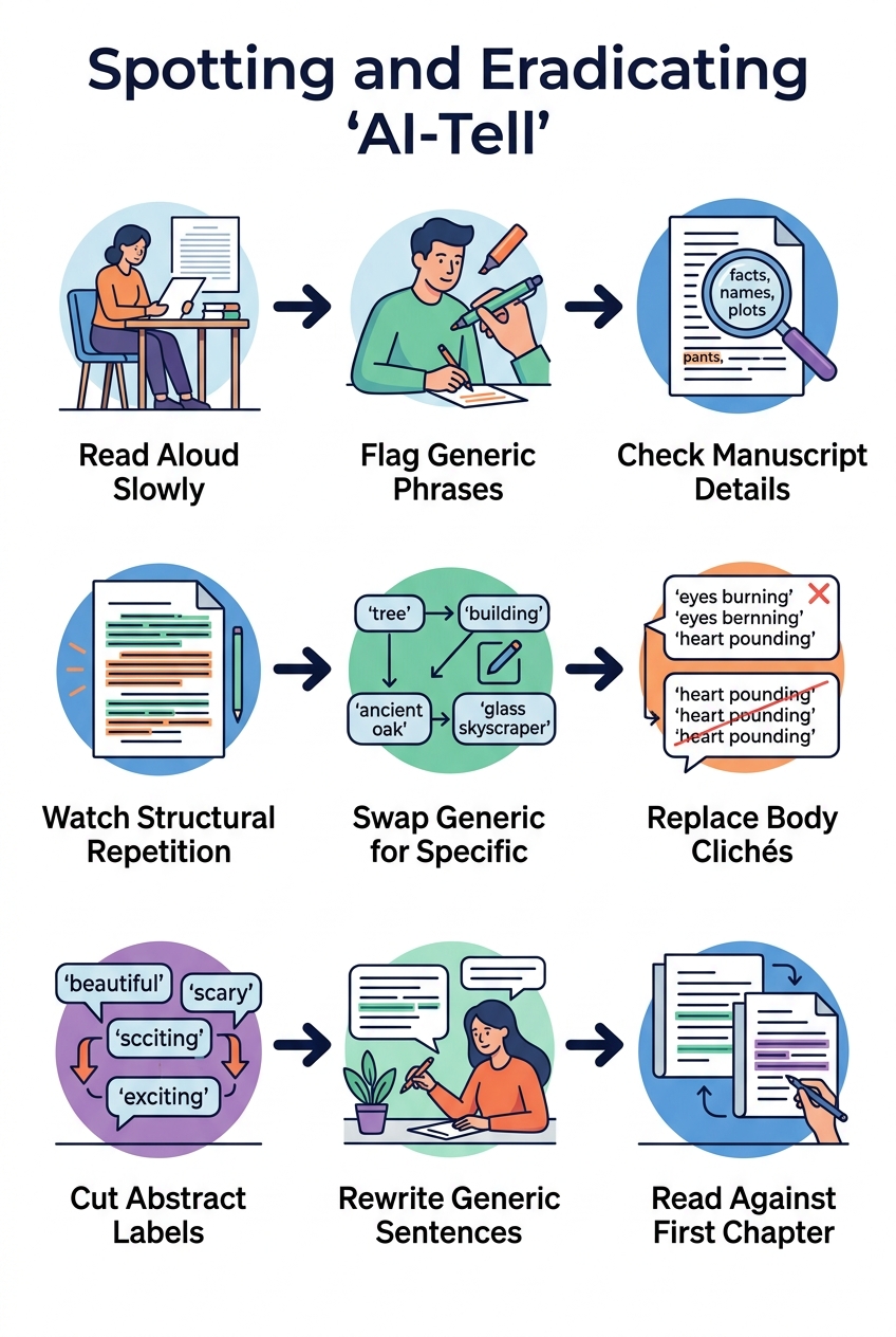 Swap the generic for the specific. If the AI wrote "his piercing gaze," ask yourself what your actual hero's eyes do in a tense scene. Do they go flat?